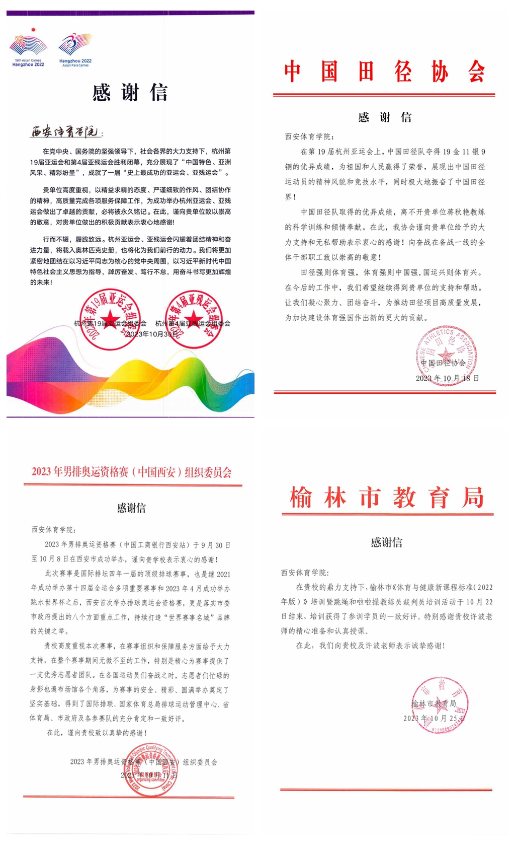 本网讯   近日,我校连续收到四封分别来自杭州第十九届亚运会组委会与杭州第四届亚残运会组委会、中国田径协会、榆林市教育局、2023年男排奥运资格赛(中国西安组织委员会)对我校在服务体育和奉献社会中的表现予以肯定和赞扬。