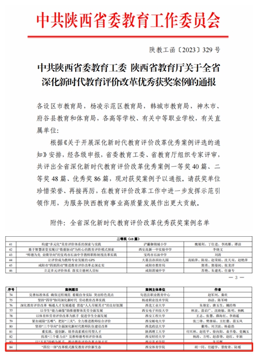 本网讯        近日,省教育工委、省教育厅公布了2023年陕西省深化新时代教育评价改革优秀案例,我校《“四位一体”改革模式激发教育评价新生态》案例获评二等奖。