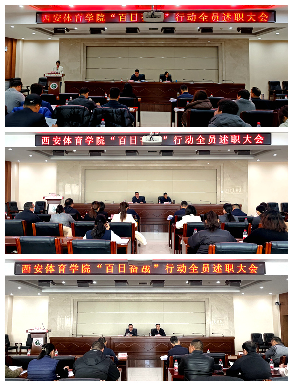 本网讯      1月24日,“百日奋战”行动全员述职大会召开运动休闲学院、体育经济与管理学院、竞技体校专场,校长李富生主持并做总结,分管联系校领导谢英、杨芳乾、张卫国出席。党校办主任张军到会。三个单位的党政班子成员、办公室主任、教学秘书、教师、教练员、辅导员参加述职。