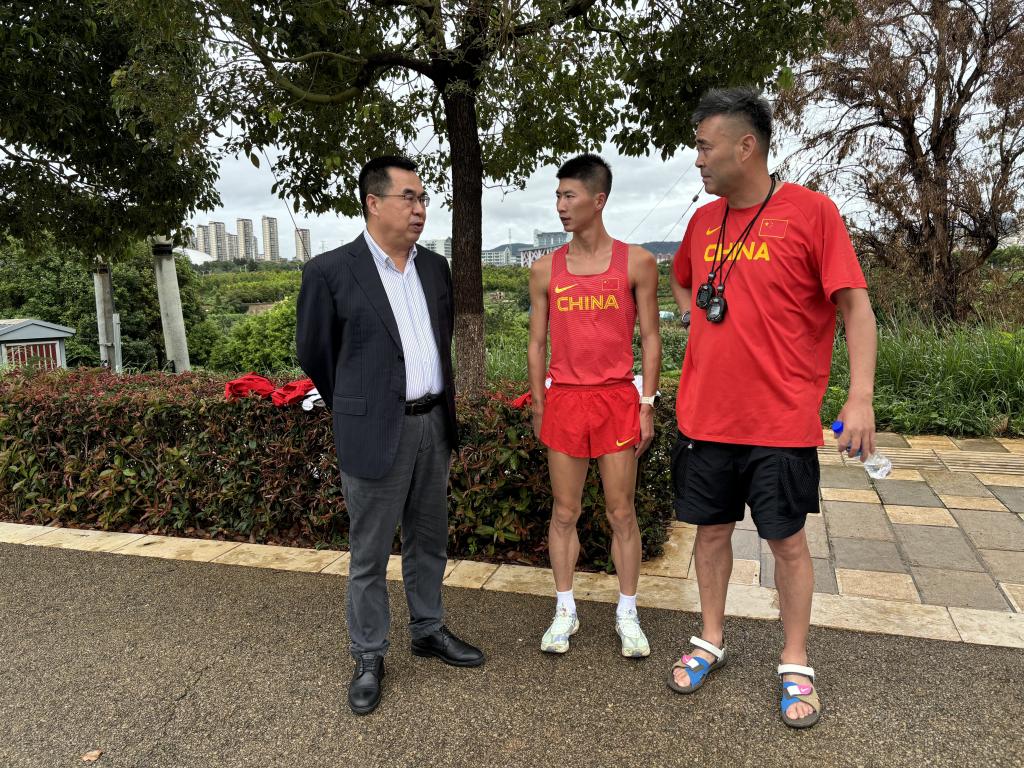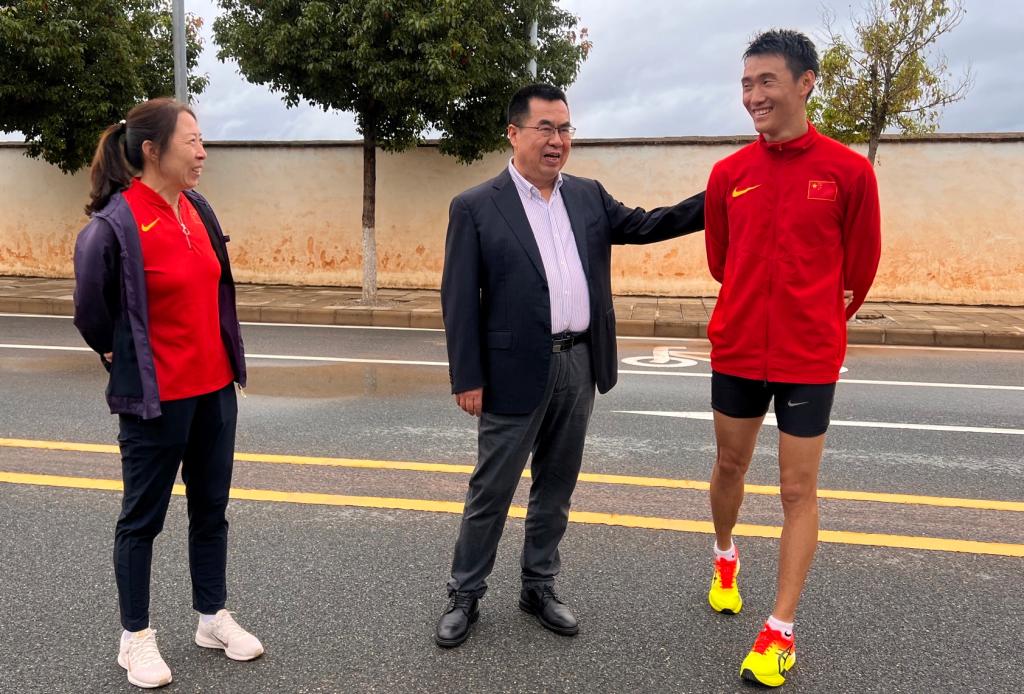 李富生一行先后来到昆明呈贡训练基地和玉溪训练基地,看望了我校入选奥运男子竞走项目的选手王朝朝和李炎东。看到他们精神饱满、状态极佳,李富生倍感欣慰,鼓励运动员继续保持良好状态,为国家争光、为学校添彩。李富生还亲切慰问了王朝朝的教练王列东(陕西籍)、中国竞走队领队张远(我校附属竞技体校辅导员)和李炎东的陪练温永杰(我校运动员),对他们为选手们的成长训练付出的辛勤努力表示肯定和感谢。