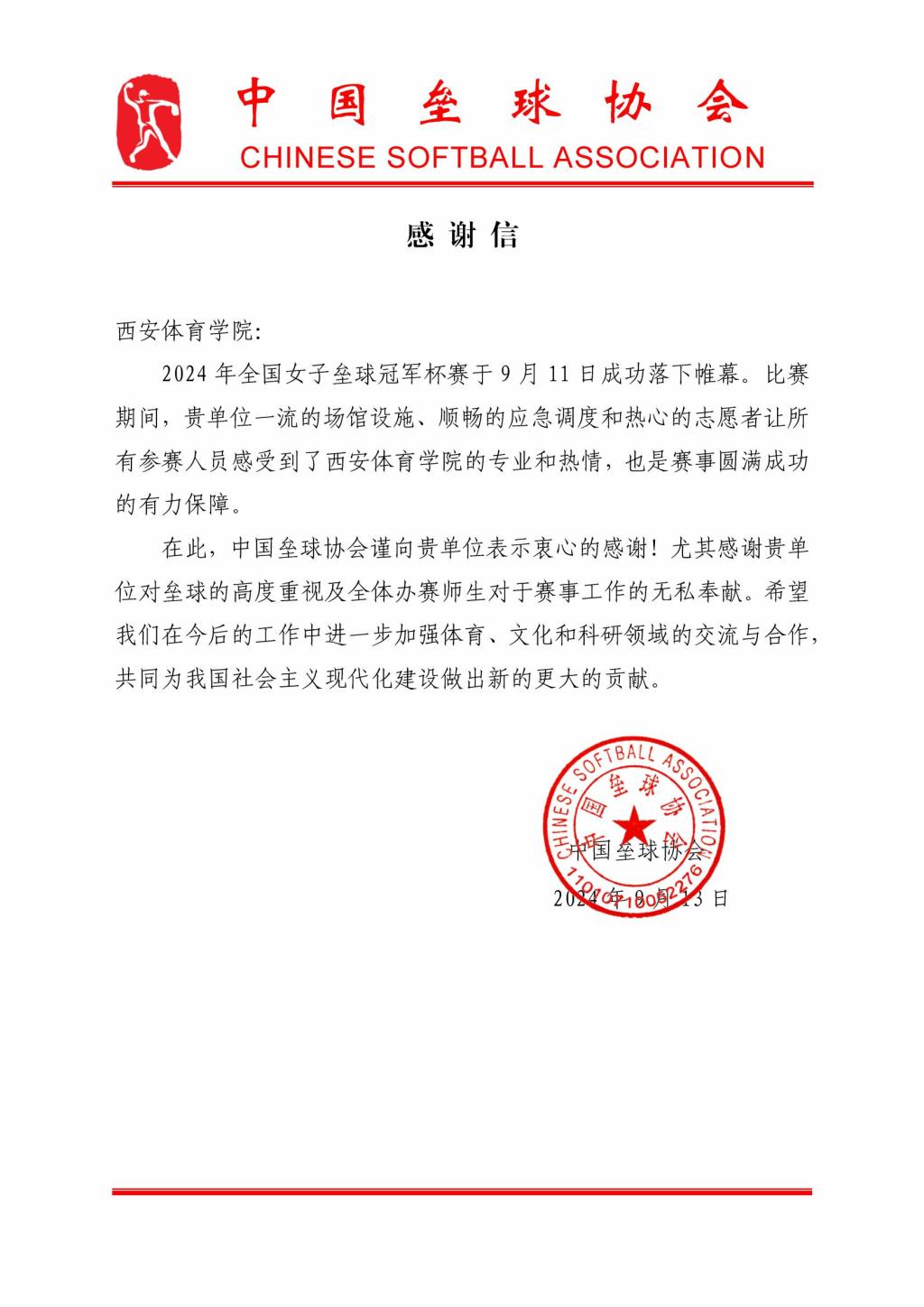 本网讯    由我校承办的2024年全国女子垒球冠军杯赛于9月11日圆满落幕。 近日,中国垒球协会向我校致信,感谢我校在垒球推广和发展中的重要作用及全体办赛师生的无私奉献精神。