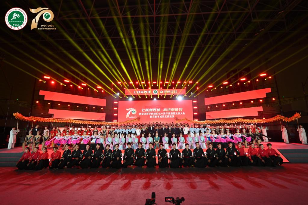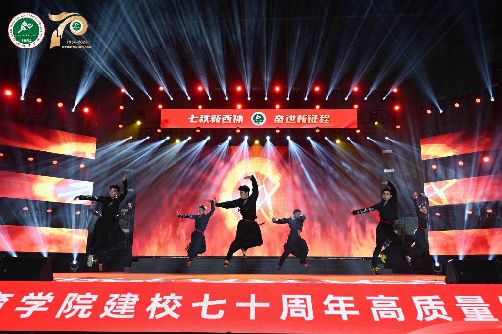 参会领导和嘉宾共同观看了学校教学成果展演。师生为各位来宾和校友举办了一场精彩纷呈的“体育+文化+艺术”展演。本次展演共分为五个篇章:“精心筹建”“艰难初创”“持续发展”“加速嬗变”“崛起辉煌”。展演由《龙腾鼓舞》这一具有陕西特色的腰鼓表演拉开帷幕,通过安塞腰鼓龙腾鼓舞之姿回首七秩风华。将体育与中华优秀传统文化高度结合的舞蹈表演《薪火》《秦·怀》《蹴鞠仕女》,体现了西体深厚的文化艺术底蕴。武术表演《舞动乾坤》、操舞组合《奋斗青春》,激扬奋进、酣畅淋漓。最后,以西体老、中、青三代师生代表,百人齐唱《光荣与梦想之歌》,承载着代代西体人对于母校建设和国家体育、教育事业发展的美好愿景。