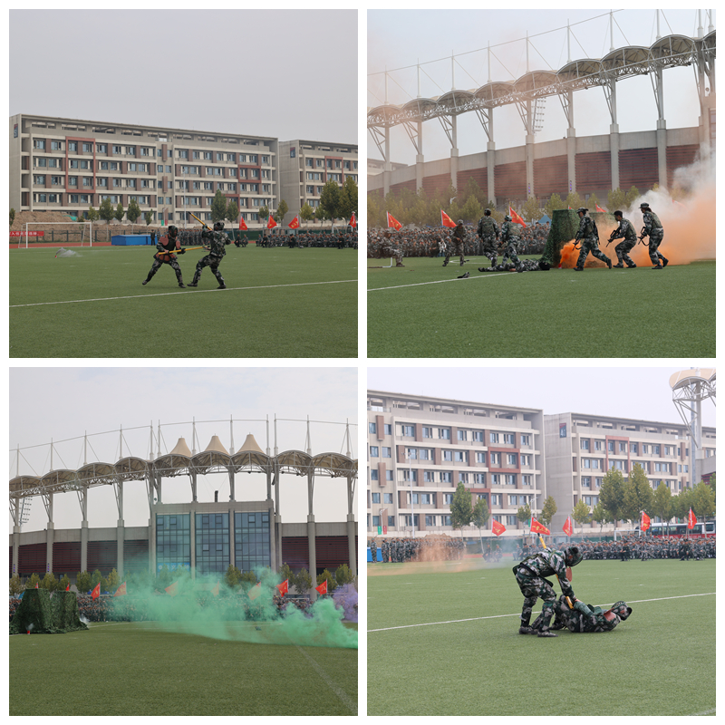 随着仪仗队伍引领着军训团的旗帜缓缓通过主席台前,标志着本次军训实践汇报演出的正式开始。随后,一列列表演方阵及来自不同学院的连队方阵,在有序的步伐中逐一亮相于主席台前接受检阅。同学们的动作协调一致,步伐稳健有力,口号响彻云霄,每一个动作都彰显着青春的活力与不屈的意志,稚嫩的面庞上透露出坚毅与热情的光芒。经过精心选拔,各营涌现出独具特色的连队,并进行了专项技能的强化训练。2024新生代表表演了军体拳、警棍盾牌操、刺杀操、匕首操等在内的精彩汇报表演,他们的动作刚劲有力、气势磅礴,犹如猛虎下山,震撼人心,赢得了经久不息的热烈掌声。