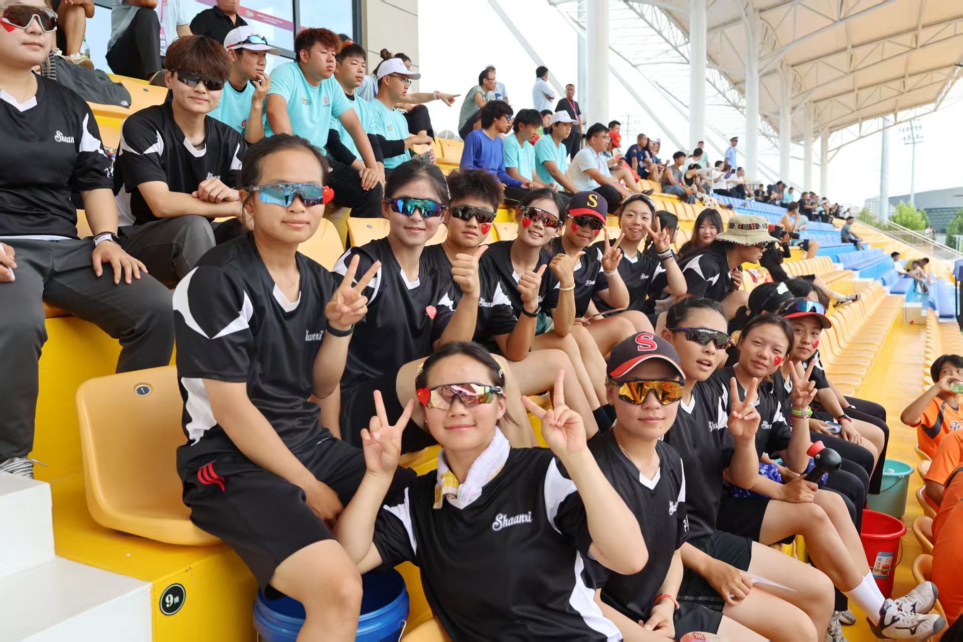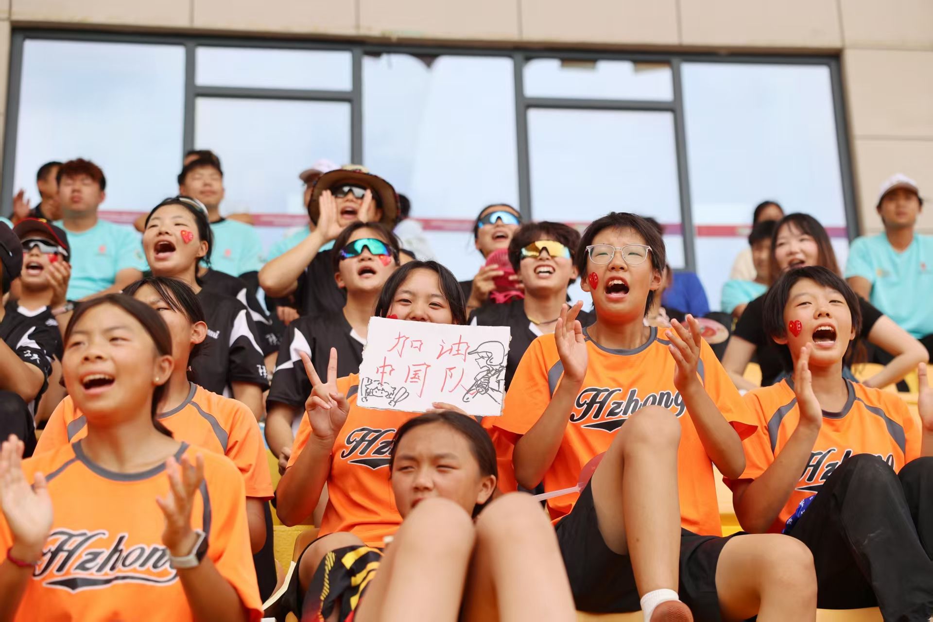 人群中有个墨绿色的小小身影在聚精会神的观赛。“看!棒球小子李宝金龙又来了!”13岁的少年举着自制的旗帜,上面绘着赛事徽标和“中国加油”的大字:“今天的比赛很激烈也很持久,打了两个小时了还没分出胜负,运动员姐姐们真的不容易。”这面旗帜承载了李宝金龙对垒球的热爱。“在久久不卡区的赛场上挥舞这面旗,感觉格外有意义,每次中国队得分,我都忍不住挥舞它!”他的父亲笑着说。
